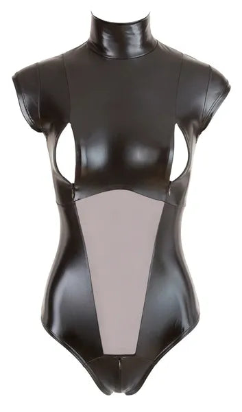 Sleeveless wetlook body with a stand-up collar and powernet insert at the front. The zips are the icing on the cake because there are zips over the breasts and a 2-way zip over the crotch. There is a longer zip at the back for putting on and taking off the body. 92% polyester, 8% elastane.